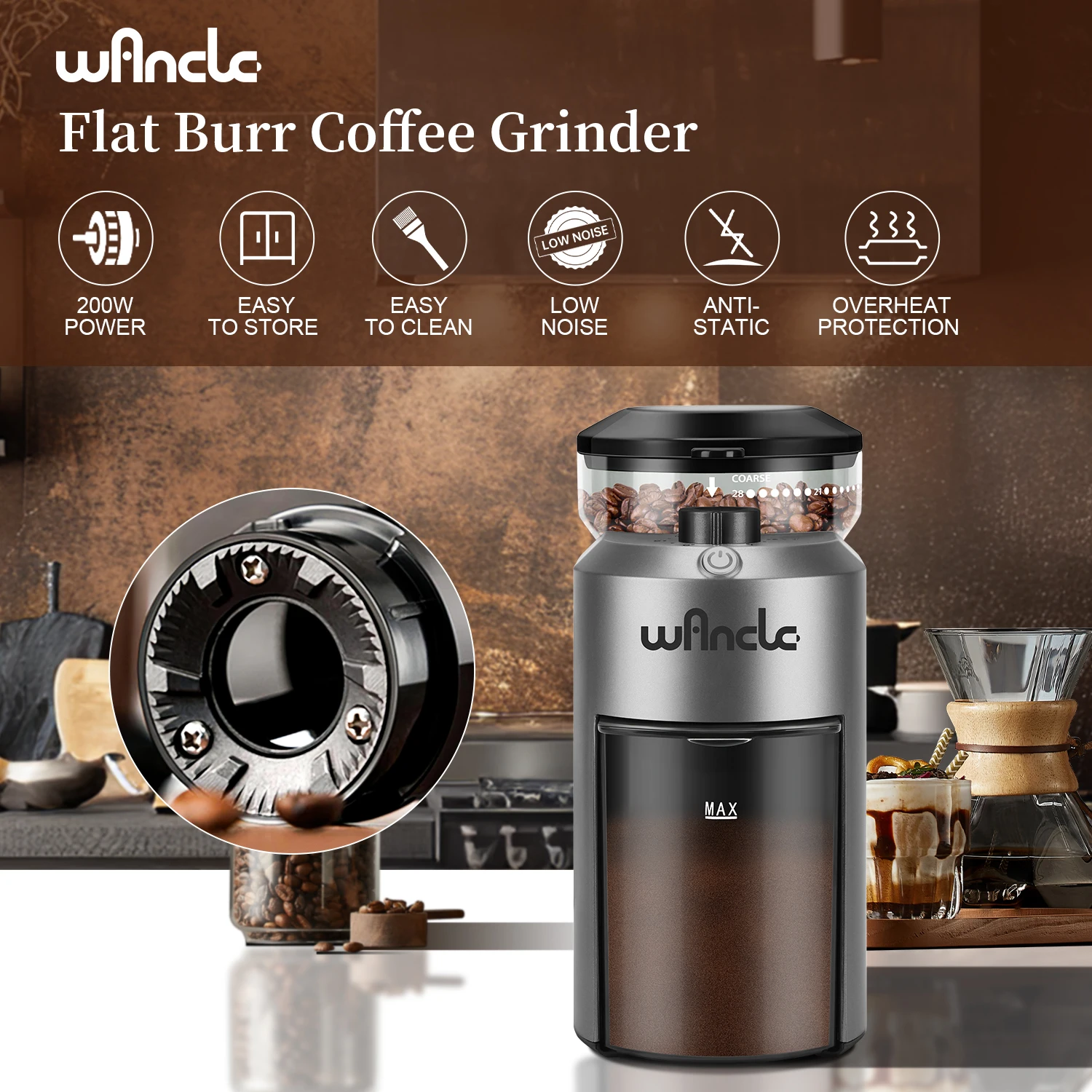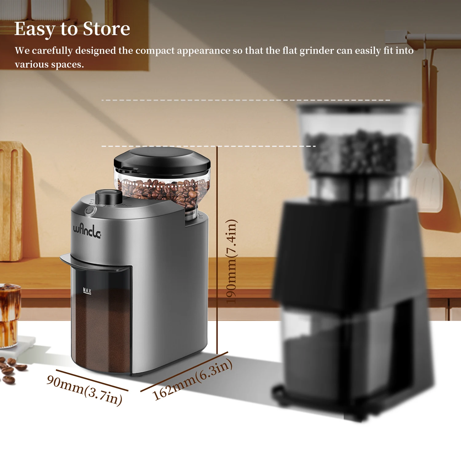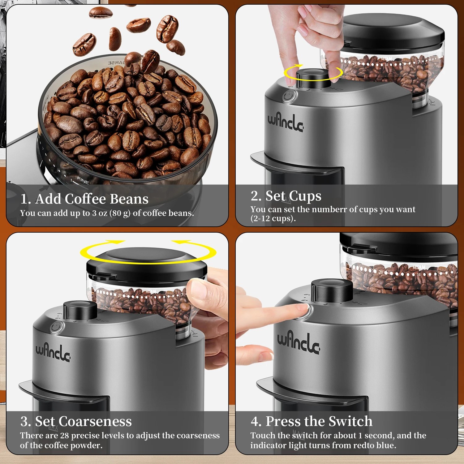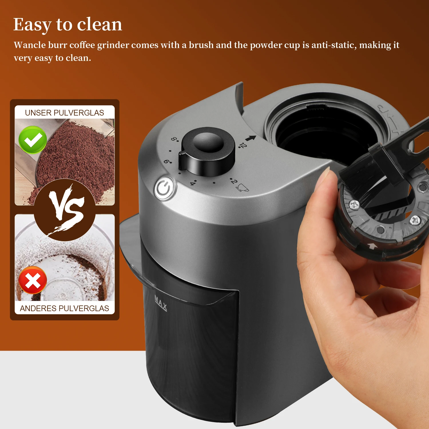 [Easy to Store]We carefully designed the compact appearance so that the flat grinder can easily fit intovarious spaces.[Easy to Clean]Wancle burr coffee grinder comes with a brush and the powder cup is anti-static, making it very easy to clean.☆HOW TO USE WANCLE COFFEE BURR GRINDER?STEP1:Add Coffee BeansSTEP2:Set the number of cupsSTEP3:Set the coarseness of the coffee powderSTEP4:Press the Switch