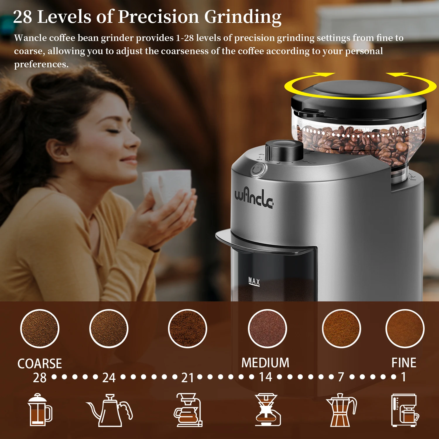 ☆Product Features:☕【Consistent Flavor Extraction】Our electric burr coffee grinder offers 28 precise grinding settings, allowing you to adjust it freely according to your taste, from coarse to fine grinding. This ensures that every cup of coffee has a good, even grind and flavor extraction while retaining the oils without generating excessive heat.☕【On-Demand Control, Perfect for 2-12 Cups】This coffee grinder features on-demand grinding control, allowing you to choose the amount of coffee to grind as needed, from as little as 2 cups to as many as 12 cups, customizing the perfect amount of coffee grounds for you.☕【Convenient Operation, Low Noise】Our professional coffee bean grinder is easy to use. Simply adjust the coarseness setting, set the number of cups, and press the switch button, letting the grinder automatically complete the rest of the work. Plus, it operates quietly, without disturbing others.☕【Easy to Clean】Wancle burr coffee grinder's plastic container is specially treated to prevent static electricity and coffee grounds from sticking. It's also equipped with a brush for easy cleaning.☕【Compact and Lightweight, Suitable for Storage】This burr grinder is designed to be compact and extremely easy to use. It fits into various kitchen spaces and can be stored effortlessly.☆Product Information:Color:Gray/SilverStyle:MordenCertification: FCC/CE/ROHSModel Number:CBG-8000Powder Container Capacity:100GCup Count Control :2~12 cups☆Package Includes:1 * Burr Coffee Grinder Machine1 * Cleaning brush1 * Operation manual[28 Levels of Precision Grinding]Wancle coffee bean grinder provides 1-28 levels of precision grinding settings from fine to coarse, allowing you to adjust the coarseness of the coffee according to your personal preferences.[Powder Consistency]The flat grinding mechanism of Wancle Burr Coffee Grinder can make every grind uniformand consistent to preserve the original flavor and aroma of coffee beans.[Customizable Number of Cups (2-12 cups)]Whether you want a cup for yourself or are ready to share with friends,our burr coffee grindercan meet your needs.